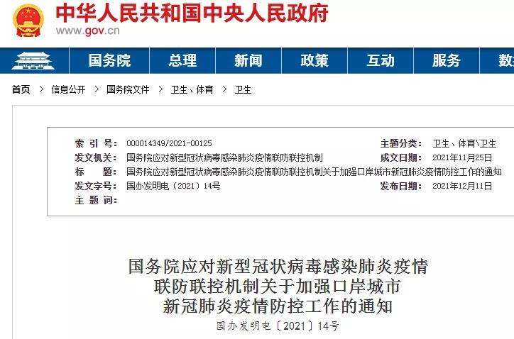 12月11日,國務院應對新型冠狀病毒感染肺炎疫情聯防聯控機制印發《關于加強口岸城市新冠肺炎疫情防控工作的通知》,其中《通知》要求做好冷鏈食品傳播風險防控工作,各省(自治區、直轄市)要抓緊組織本轄區口岸城市開展一次冷鏈相關企業風險排查,全面評估和整改各環節風險漏洞,并于2021年12月15日前將排查整改情況報送國務院聯防聯控機制綜合組。并要求離開陸地邊境口岸城市需持48小時核酸證明。