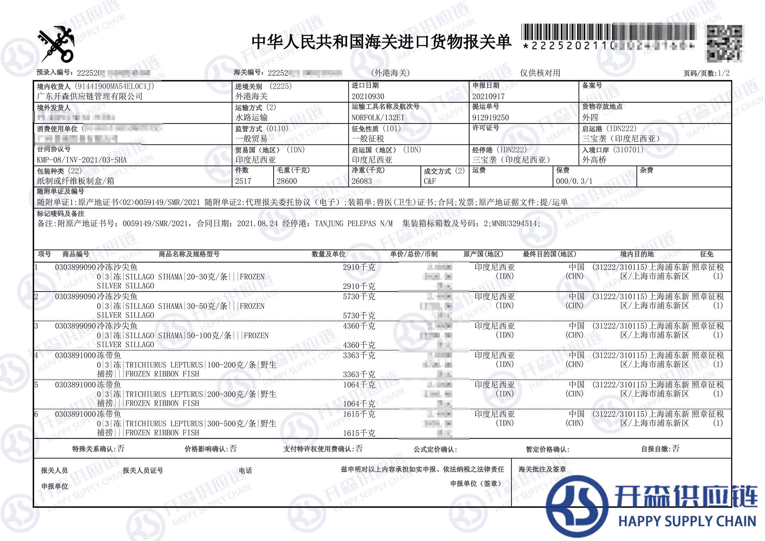 【本文結(jié)語】 上述就是印度尼西亞冷凍沙尖魚進(jìn)口報關(guān)代理服務(wù)【經(jīng)典案例】的全部內(nèi)容,希望能對您有所幫助,如有水產(chǎn)品進(jìn)口報關(guān)上任何疑問及問題可隨時在線聯(lián)系我們或撥打 18002611553,開森供應(yīng)鏈擁有豐富的水產(chǎn)品進(jìn)口報關(guān)操作經(jīng)驗(yàn)及案例,10余年進(jìn)口經(jīng)驗(yàn)為您所用,各類進(jìn)口疑難都能為您一一解答及協(xié)助快速處理解決!
