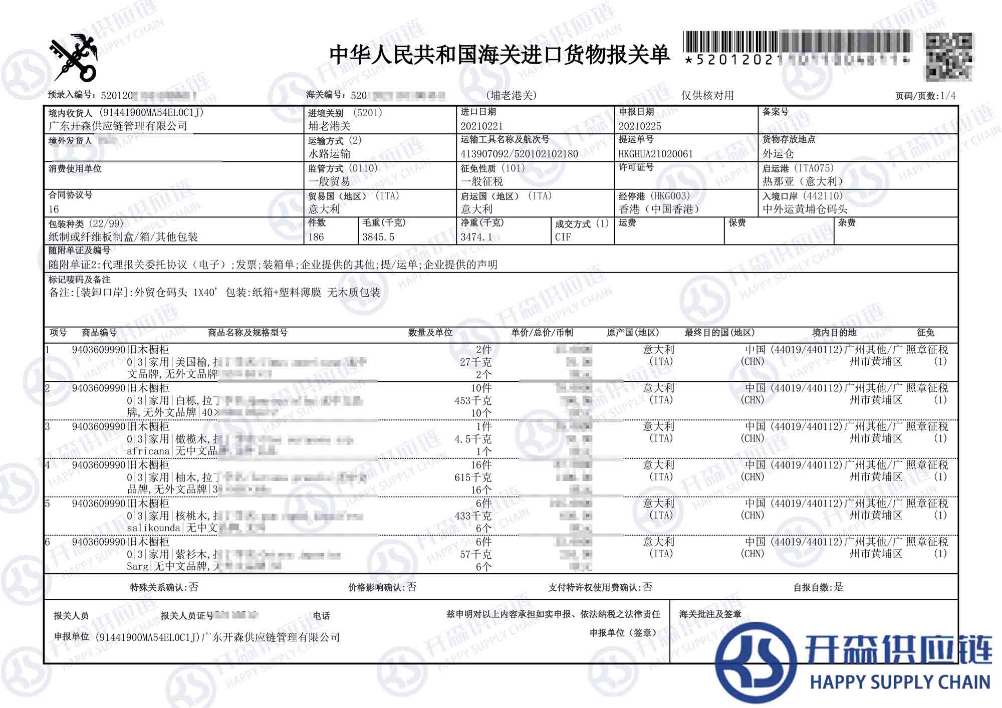 【本文結語】 上述就是意大利舊木櫥柜家具進口報關代理案例【進口案例】的全部內容,希望能對您有所幫助,如有二手家具進口報關上任何疑問及問題可隨時在線聯系我們或撥打 18002611553,開森供應鏈擁有豐富的二手家具進口報關操作經驗及案例,10余年進口經驗為您所用,各類進口疑難都能為您一一解答及協助快速處理解決!