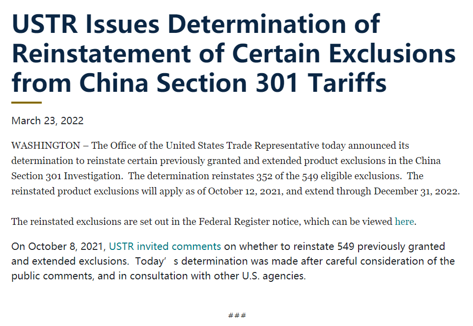 當地時間23日,美國貿易代表辦公室發(fā)布聲明,宣布重新豁免對352項從中國進口商品的關稅,該新規(guī)定將適用于在2021年10月12日至2022年12月31日之間進口自中國的商品。