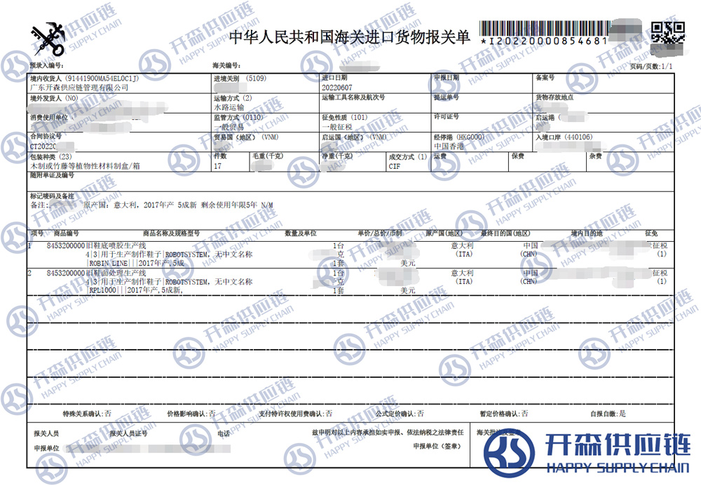 【本文結語】 上述就是二手制鞋生產線設備進口報關清關代理案例【經典案例】的全部內容,希望能對您有所幫助,如有二手機械進口報關上任何疑問及問題可隨時在線聯系我們或撥打 18002611553,開森供應鏈擁有豐富的二手機械進口報關操作經驗及案例,10余年進口經驗為您所用,各類進口疑難都能為您一一解答及協助快速處理解決!