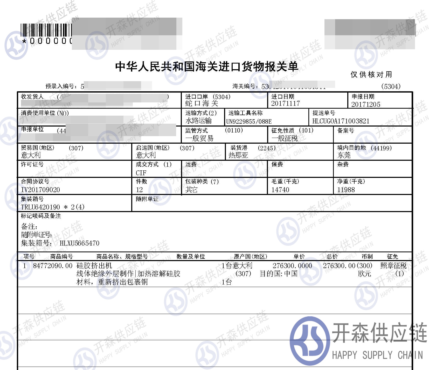 從意大利進(jìn)口一臺(tái)硅膠擠出機(jī)到深圳蛇口碼頭,我司提供門(mén)到門(mén)機(jī)械設(shè)備進(jìn)口一站式清關(guān)服務(wù),開(kāi)森擁有十余年二手機(jī)械設(shè)備進(jìn)口清關(guān)經(jīng)驗(yàn)及案例,為客戶提供量身制作的進(jìn)口方案,讓客戶進(jìn)口省時(shí)省心省成本。