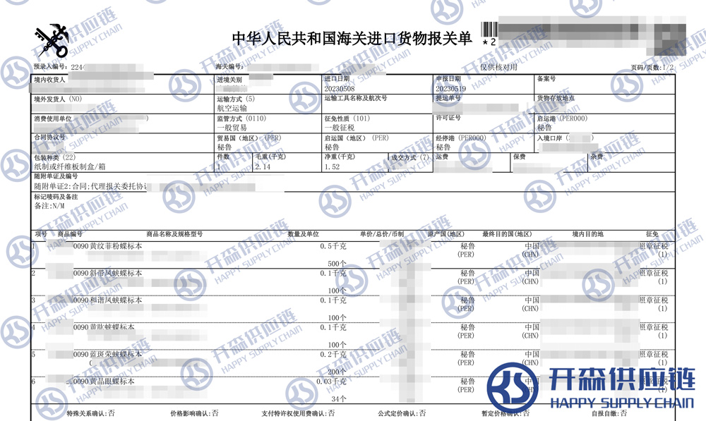 【導讀】您正在閱讀的是關于秘魯蝴蝶標本進口報關清關代理服務【經典案例】的內容,本文由開森蝴蝶標本進口報關代理小編整理編寫;